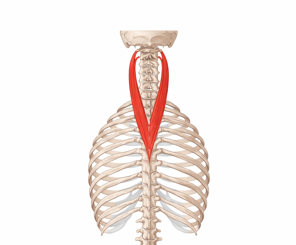 The splenius cervicis lies in the posterior neck and upper upper-back region. It arises from the spinous processes of T3 to T6 and inserts into the transverse processes of C1 to C3. Together with the splenius capitis, it forms part of the splenius muscle group in the cervical region, helping connect the upper thoracic spine to the cervical spine (Kenhub, n.d.; Henson et al., 2023).